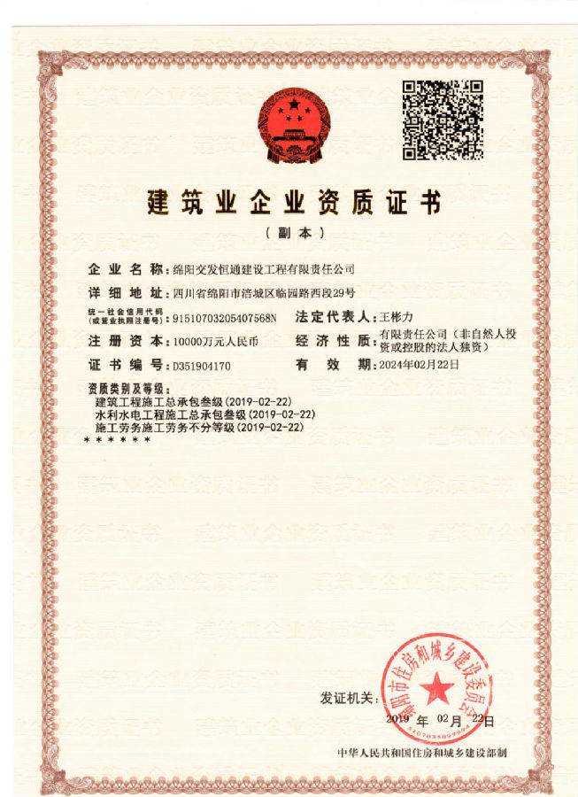 近日,經(jīng)綿陽市住房和城鄉(xiāng)建設(shè)委員會(huì)審核批準(zhǔn),恒通建工成功取得建筑工程施工總承包、水利水電施工總承包叁級、施工勞務(wù)施工勞務(wù)不分等級三個(gè)資質(zhì),標(biāo)志著公司順利拿到建筑工程、水利水電、施工勞務(wù)市場“入場券”。