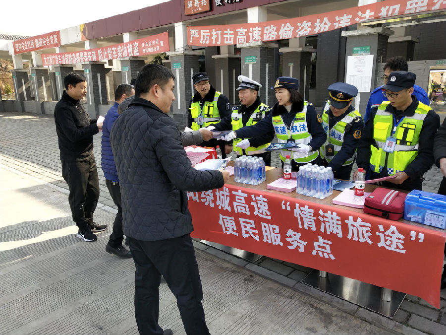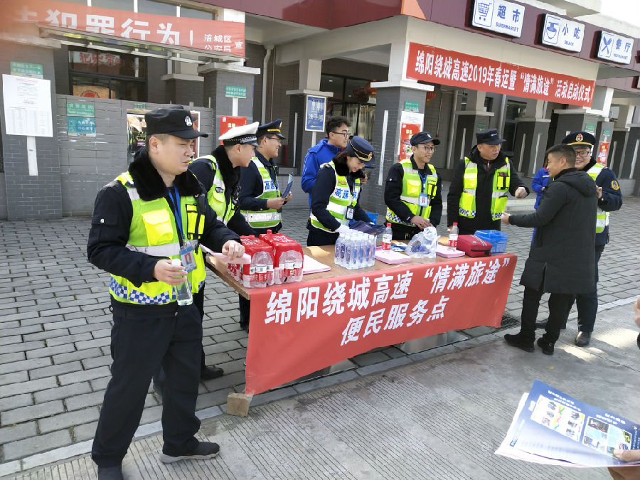 1 月 21 日,綿陽繞城高速管理所聯(lián)合高速交通執(zhí)法、高速交警 在綿陽南服務(wù)區(qū)舉行了綿陽繞城高速 2019 年春運暨“情滿旅途” 活動啟動儀式。儀式現(xiàn)場設(shè)立了“春運安全 情滿旅途”宣傳點 和便民服務(wù)點,積極開展了咨詢引導(dǎo)、秩序維護、便民利民、應(yīng) 急救護等便民服務(wù)工作,主動為過往司乘人員特別是農(nóng)民工提供 開水藥品、交通咨詢、車輛維修、應(yīng)急救援等暖心服務(wù),充分讓農(nóng)民工兄弟感受到回鄉(xiāng)返崗旅途的溫暖,增進了人民群眾對綿陽 繞城高速春運服務(wù)的獲得感和認同感。為確保綿陽繞城高速春運 期間安全營運奠定了堅實的基礎(chǔ)。