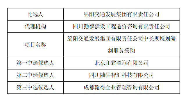 綿陽(yáng)交通發(fā)展集團(tuán)有限責(zé)任公司人力資源中長(zhǎng)期規(guī)劃編制服務(wù)采購(gòu)中選候選人公示