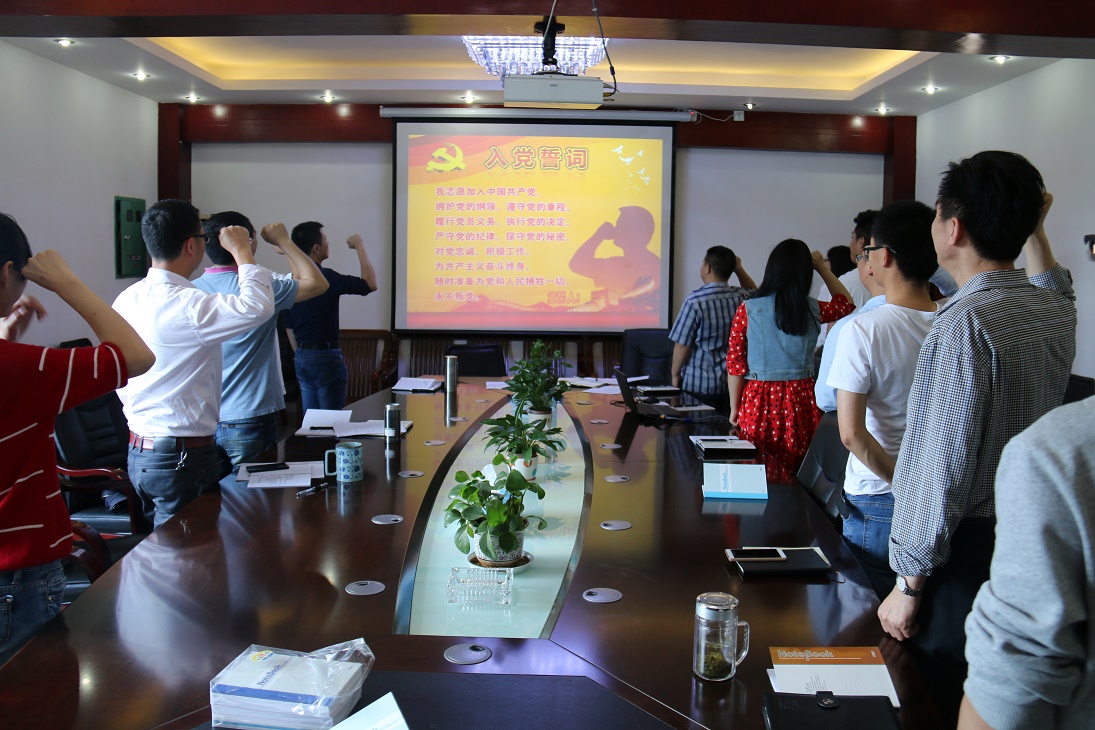 站在鮮艷的黨旗前,全體黨員一起握起右拳,重溫了入黨宣誓誓言。