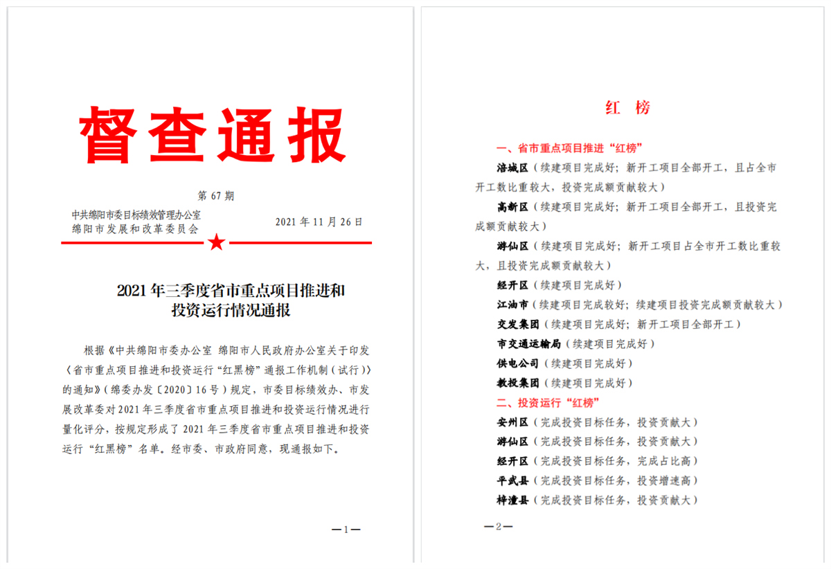 2021年11月26日,市目標(biāo)績(jī)效辦、市發(fā)改委發(fā)布了《2021年三季度省市重點(diǎn)項(xiàng)目推進(jìn)和投資運(yùn)行情況通報(bào)》。經(jīng)市委、市政府同意,集團(tuán)榮獲2021年三季度省市重點(diǎn)項(xiàng)目推進(jìn)“紅榜”。
