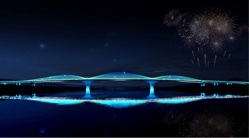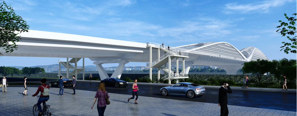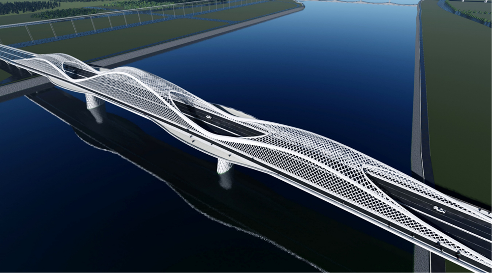 橋梁為主跨180m 連續(xù)梁橋,橋面設(shè)置層次豐富的空間網(wǎng)狀構(gòu)架,造型設(shè)計(jì)新穎,猶如在時空之隧中穿梭,體現(xiàn)綿陽科技之城不斷探求未知世界、永攀科技高峰精神?! ?/p>