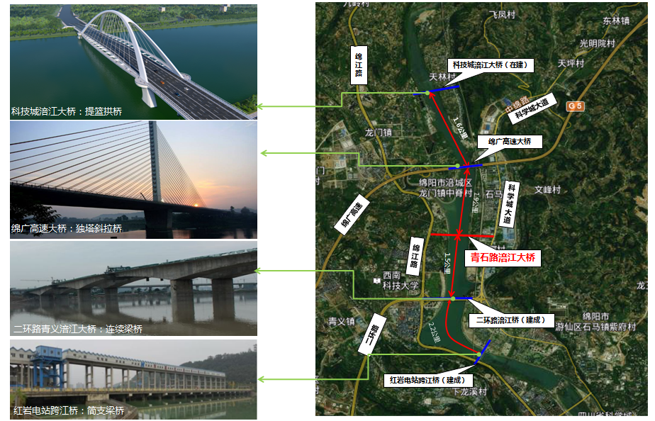 ? ? ? ?青石路涪江大橋是科技城新區(qū)北翼橫跨涪江,聯(lián)系涪城青義片區(qū)、游仙石馬片區(qū)的重要橋梁。項(xiàng)目起于青義鎮(zhèn)綿江路與青石路交叉口,止于石馬鎮(zhèn)科學(xué)城大道與青石路交叉口,全長約1.3km,含橋梁及道路兩側(cè)綠化景觀工程。