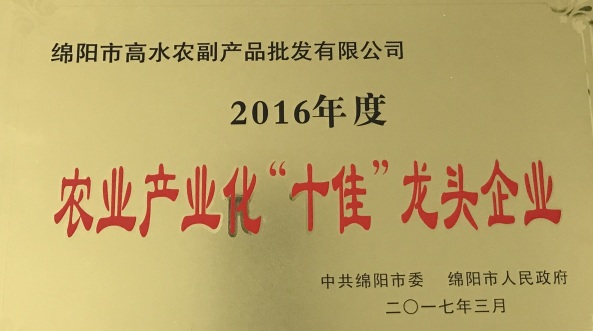 綿陽市高水農副產品批發(fā)有限公司榮獲2016年度全市農業(yè)產業(yè)化“十佳”龍頭企業(yè)