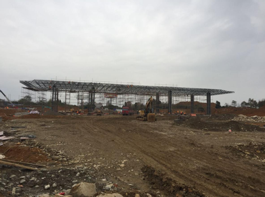 G5綿廣高速公路綿陽(金家林)收費(fèi)站改造工程 收費(fèi)站大棚網(wǎng)架拼接、吊裝順利完成