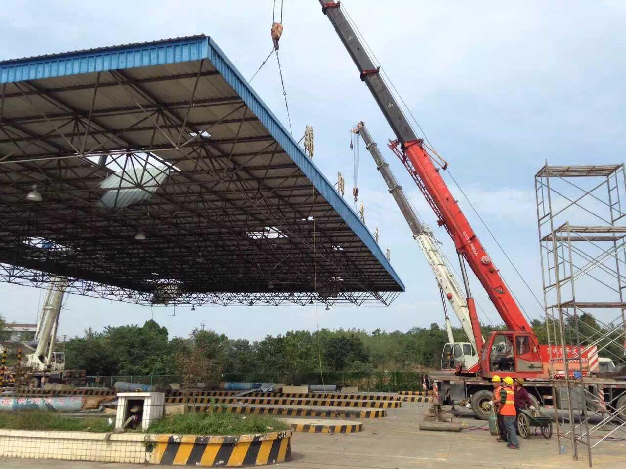 收費(fèi)大棚主跨約44米、寬約28.5米,鋼架結(jié)構(gòu),由兩臺50噸、兩臺75噸起重吊車安全吊運(yùn)于地面。