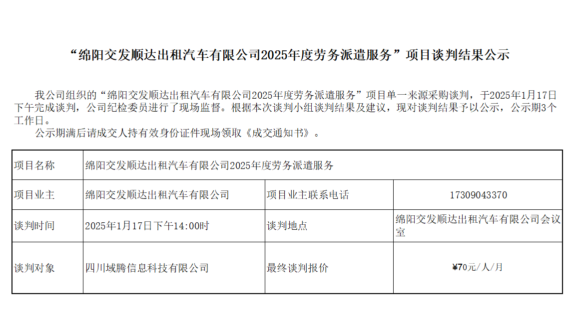 “綿陽(yáng)交發(fā)順達(dá)出租汽車有限公司2025年度勞務(wù)派遣服務(wù)”項(xiàng)目談判結(jié)果公示
