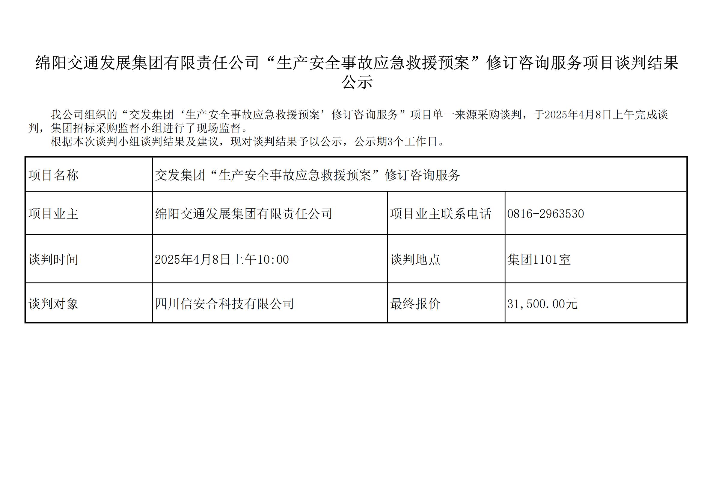 綿陽交通發(fā)展集團有限責任公司 “生產(chǎn)安全事故應急救援預案”修訂咨詢服務項目談判結果公示