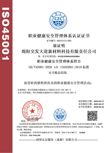 2025年4月17日,交發(fā)大道新材料公司喜獲ISO9001質(zhì)量管理體系認證證書、ISO14001環(huán)境管理體系認證證書以及ISO45001職業(yè)健康安全管理體系認證證書。此次認證的通過,標志著公司在管理體系建設方面取得突破性成就,更以“三標一體”的認證格局確立行業(yè)質(zhì)量管控新范式,彰顯公司現(xiàn)代化治理能力實現(xiàn)跨越式提升。