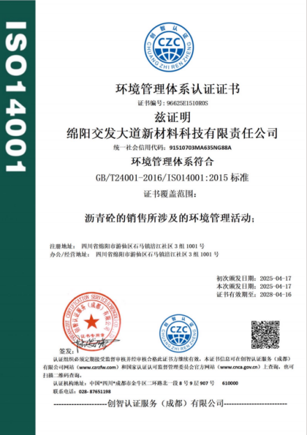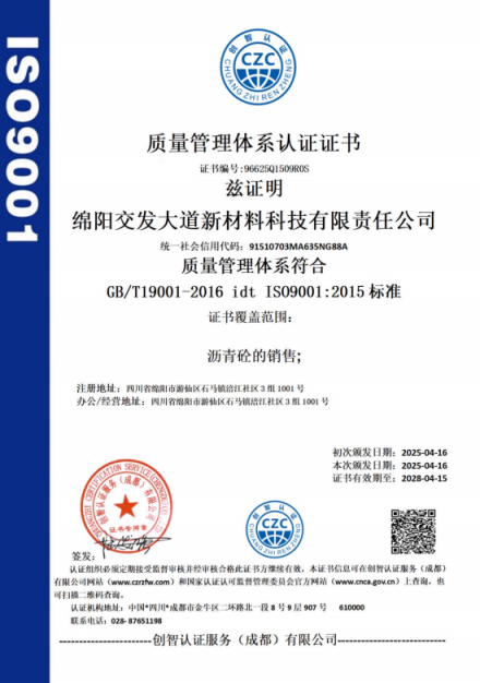 喜報!交發(fā)大道新材料公司榮獲質(zhì)量、環(huán)境及職業(yè)健康安全管理體系認證證書