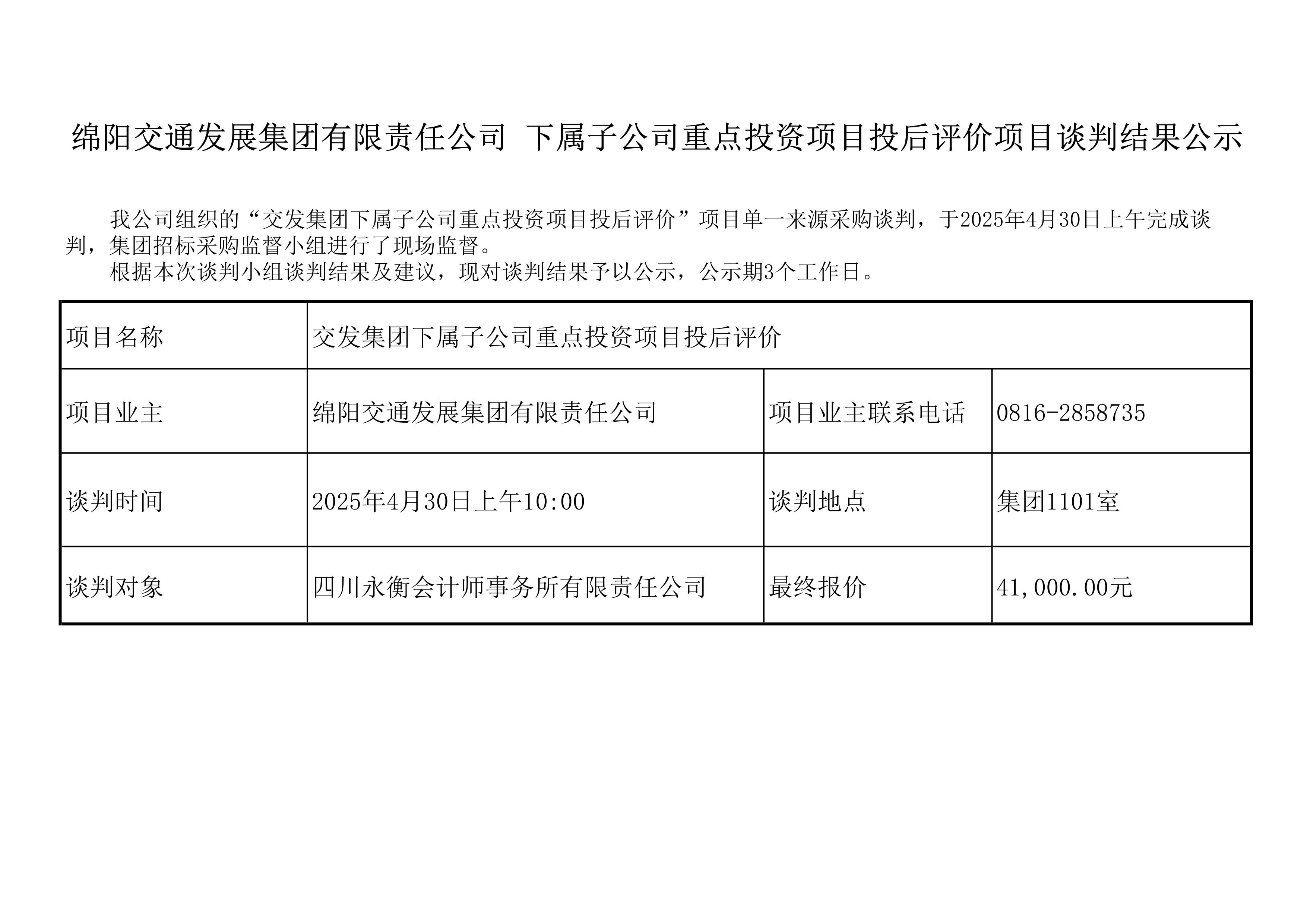 綿陽交通發(fā)展集團有限責任公司下屬子公司重點投資項目投后評價項目談判結(jié)果公示