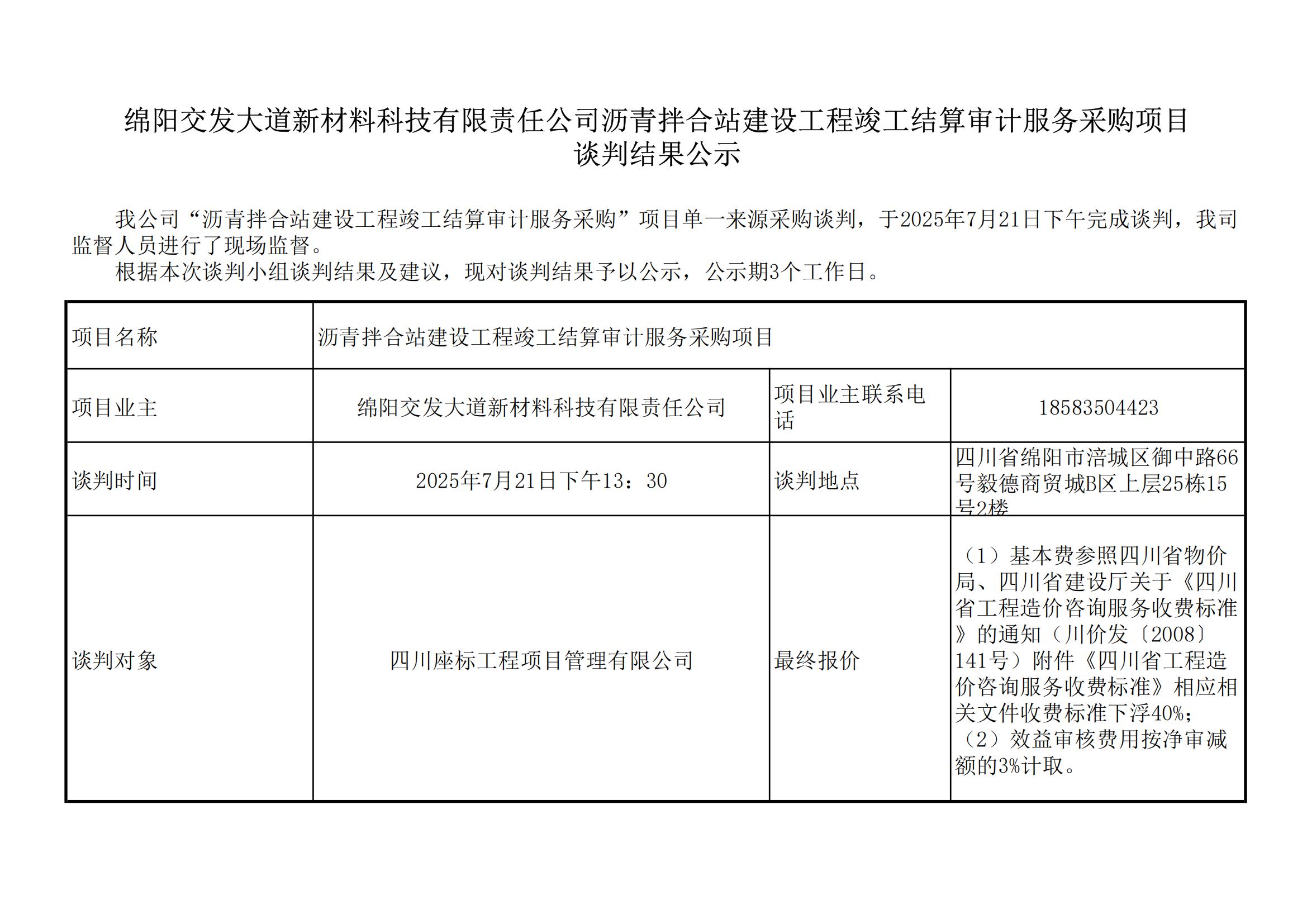 綿陽交發(fā)大道新材料科技有限責(zé)任公司瀝青拌合站建設(shè)工程竣工結(jié)算審計服務(wù)采購項目談判結(jié)果公示