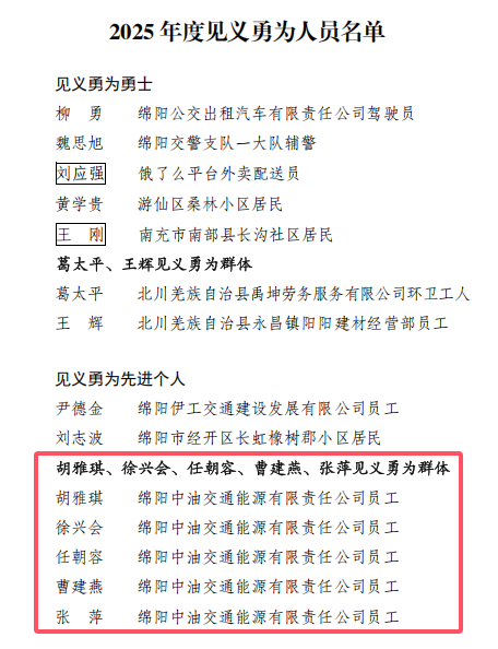 近日,綿陽(yáng)市人民政府發(fā)布《關(guān)于對(duì)2025年度見(jiàn)義勇為人員進(jìn)行獎(jiǎng)勵(lì)的決定》,運(yùn)業(yè)集團(tuán)所屬綿陽(yáng)中油交通能源有限責(zé)任公司胡雅琪、徐興會(huì)、任朝容、曹建燕、張萍五位員工獲見(jiàn)義勇為群體表?yè)P(yáng)。她們?cè)谵I車自燃危機(jī)中挺身而出的英勇事跡,不僅為城市安全筑起“防護(hù)墻”,更以實(shí)際行動(dòng)詮釋了國(guó)企員工的責(zé)任擔(dān)當(dāng),譜寫了新時(shí)代“她力量”的動(dòng)人篇章。