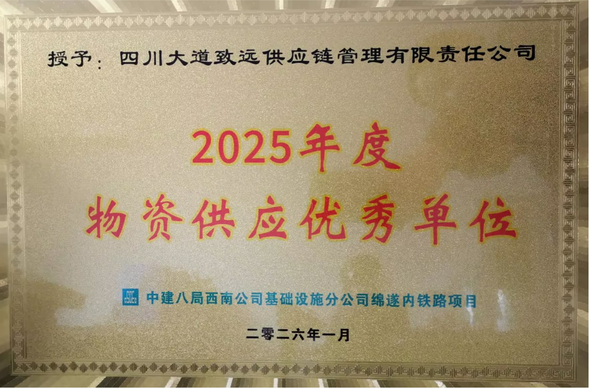 大道供應(yīng)鏈公司榮獲綿遂內(nèi)鐵路項(xiàng)目 “2025年度物資供應(yīng)優(yōu)秀單位”