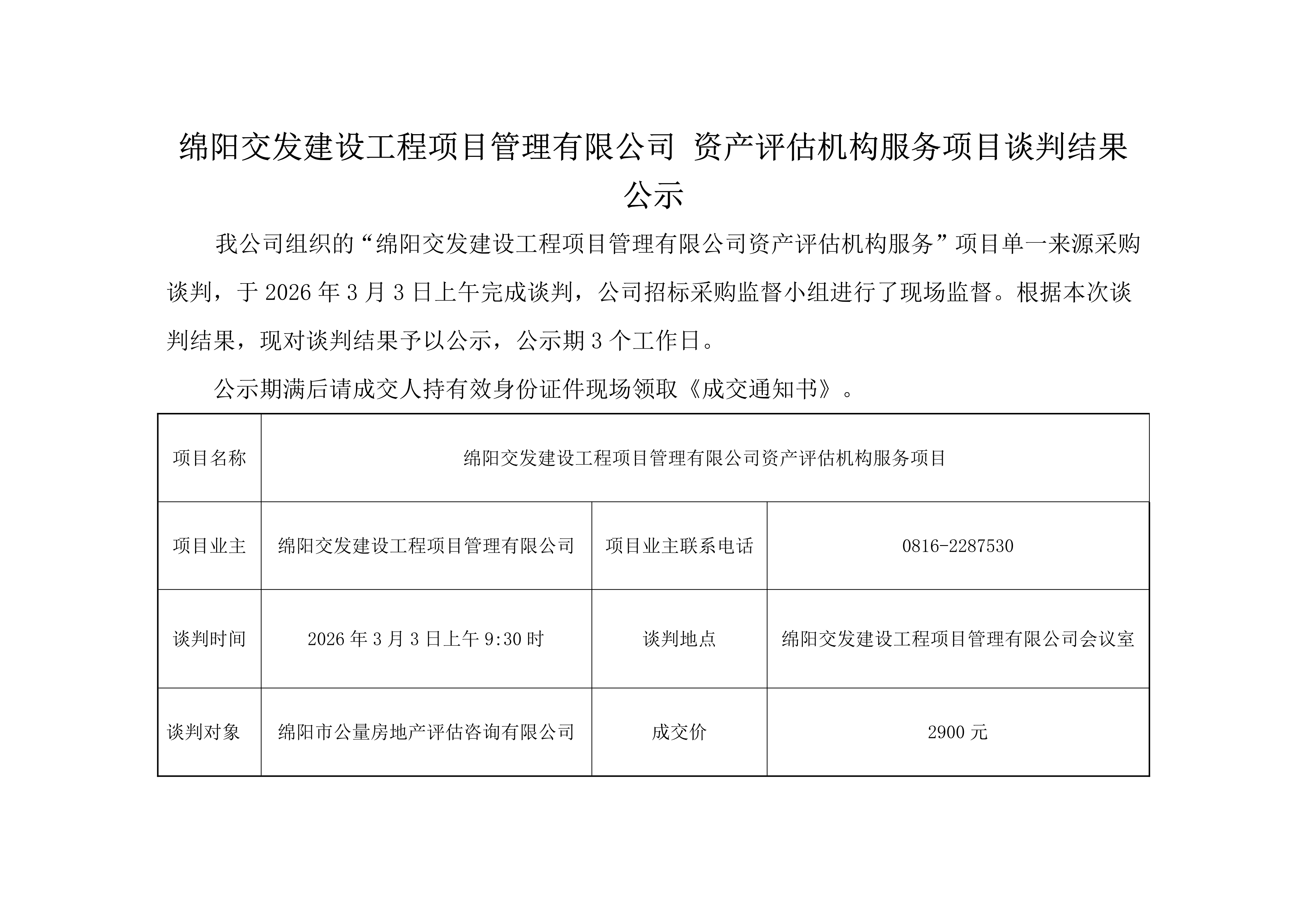 綿陽交發(fā)建設(shè)工程項目管理有限公司 資產(chǎn)評估機(jī)構(gòu)服務(wù)項目談判結(jié)果公示