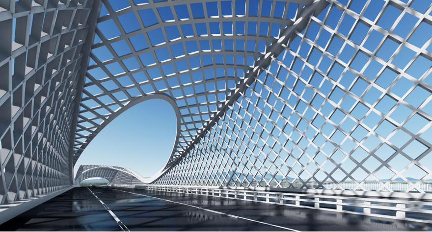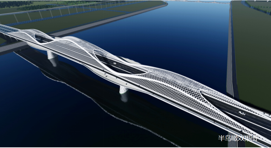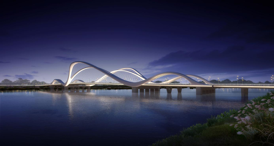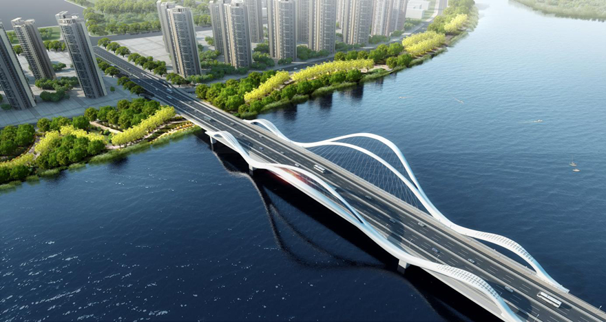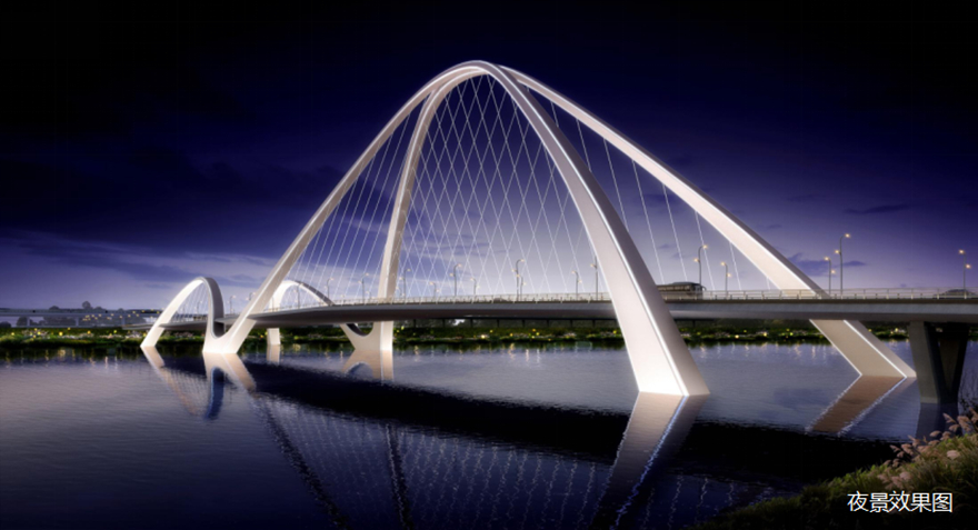 橋梁采用主橋300m下承式系桿拱橋。主拱拱肋具有雕塑感,模仿種子萌芽造型,搭配兩側(cè)小拱,形成眾星捧月之勢,寓意科技創(chuàng)新的萌芽,充分表達科技城的創(chuàng)新力、生命力。