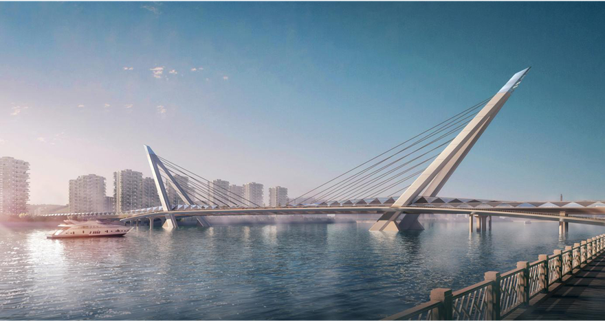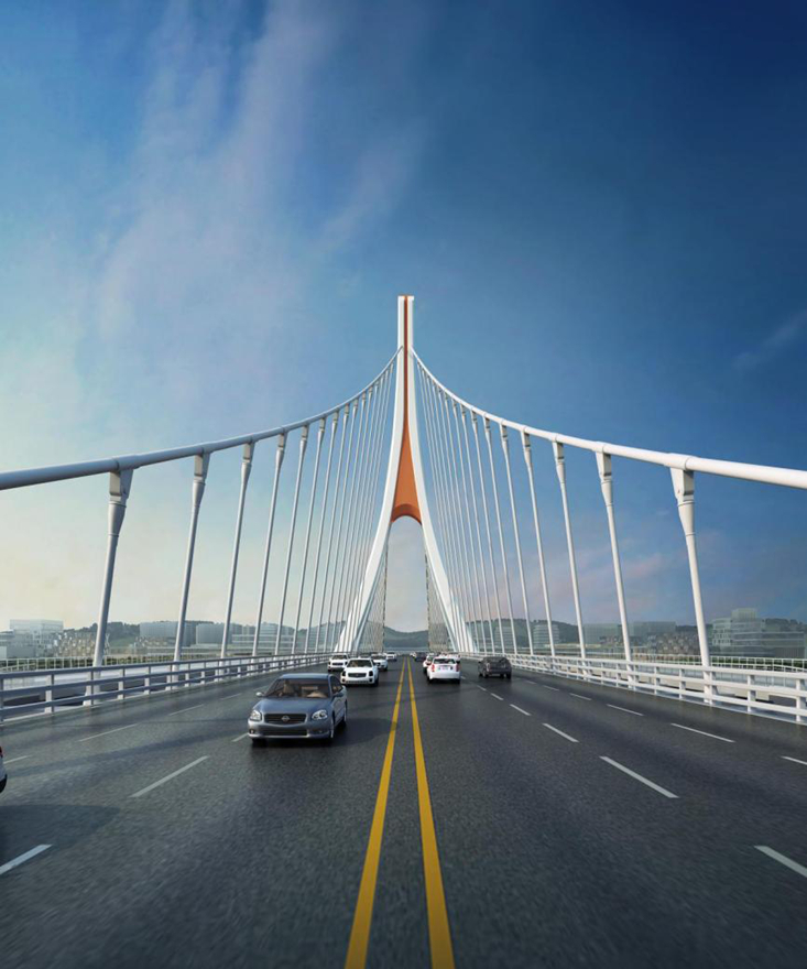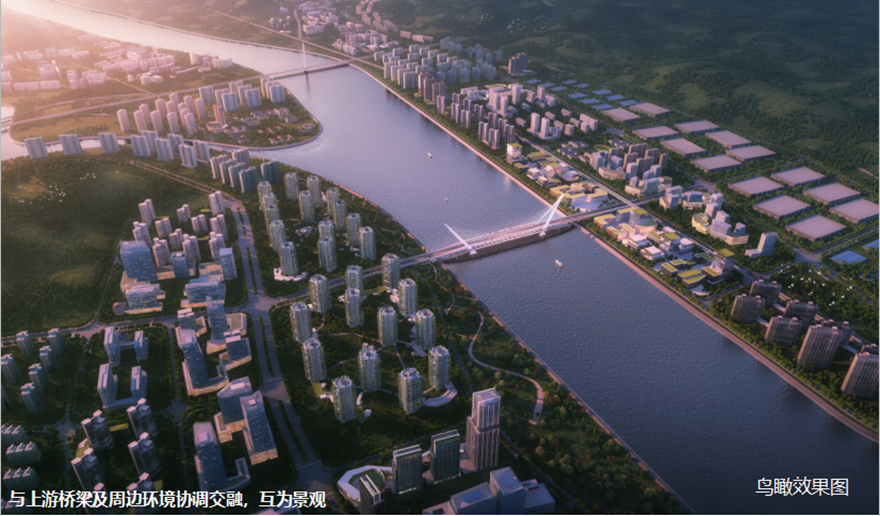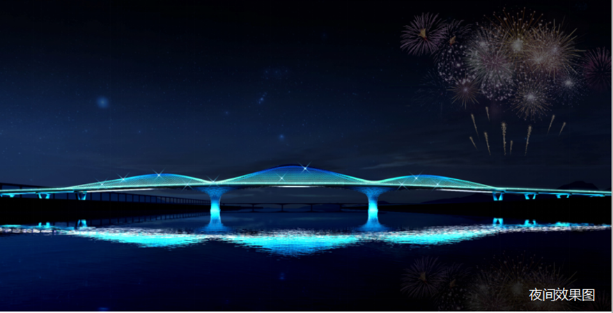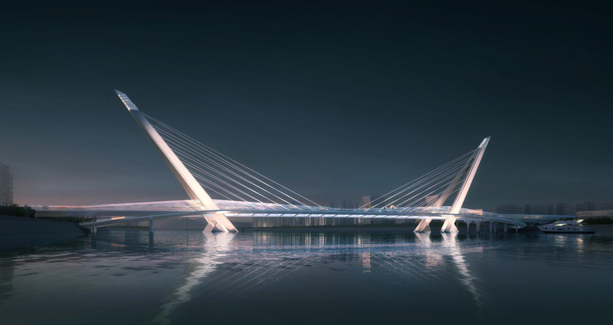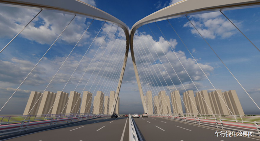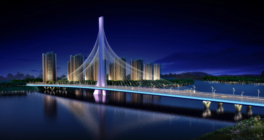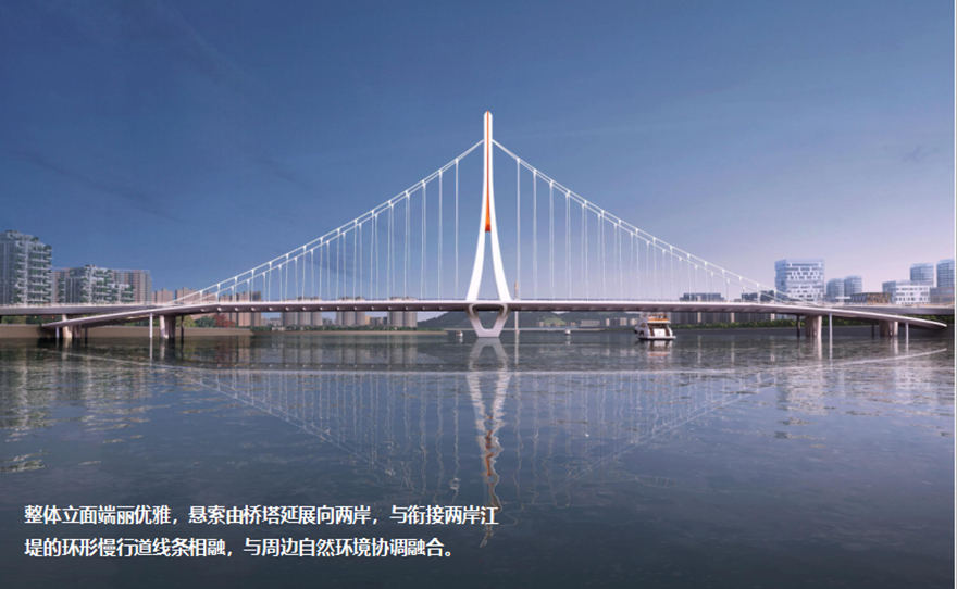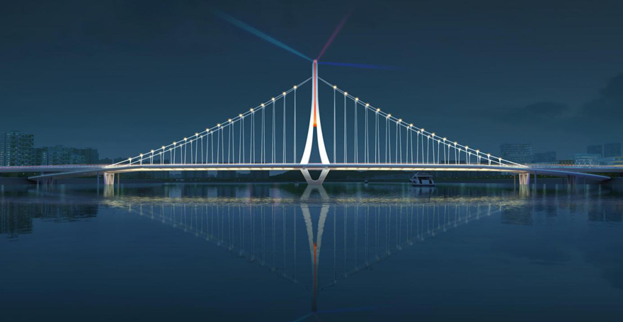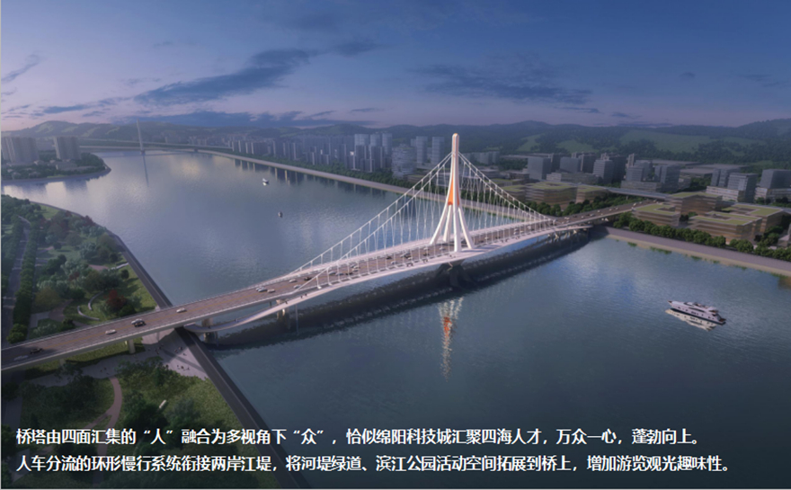 橋梁采用主跨2×156m獨塔懸索橋。方案以四面匯聚的“人”薈萃為多視角下的“眾”,融洽成“人和”,象征綿陽人杰地靈,吸引四面八方的人才匯聚一堂,萬眾一心,共同點亮屬于中國科技城的燦爛星空。