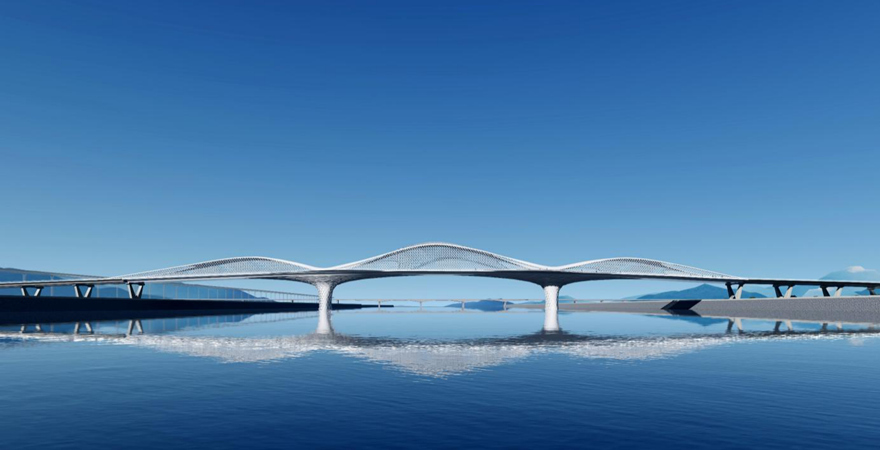 橋型采用主跨2×152m 空間索面斜拉橋。主塔似巨柱擎天,配合如禪意般的索面扭轉(zhuǎn)空間,猶如破水而出、蓄勢待飛的雕塑。